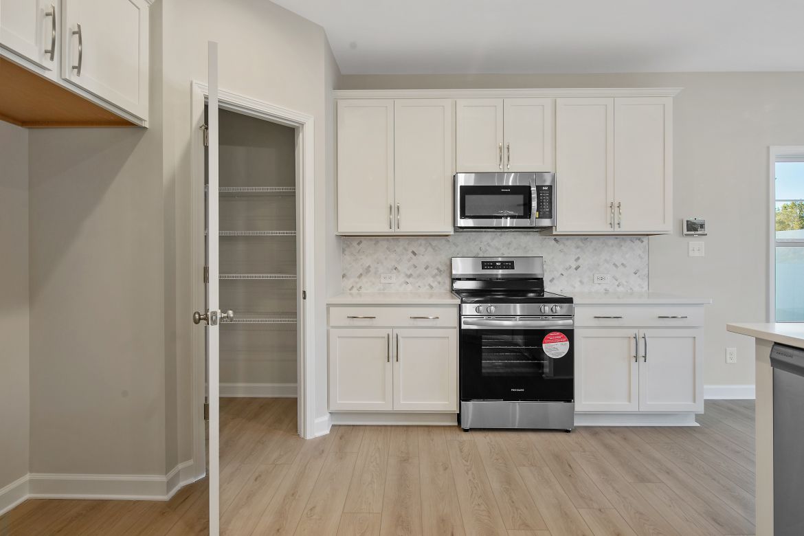 - Kitchen with corner pantry and gourmet kitchen layout options with double wall ovens and cooktop; open dining area with triple window option